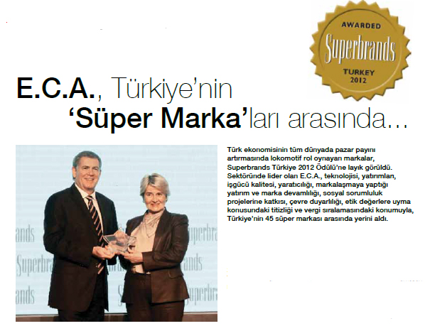 Türk ekonomisinin tüm dünyada pazar payını artırmasında lokomotif rol oynayan markalar, Superbrands Türkiye 2012 Ödülü’ne layık görüldü. Sektöründe lider olan E.C.A., teknolojisi, yatırımları, işgücü kalitesi, yaratıcılığı, markalaşmaya yaptığı yatırım ve marka devamlılığı, sosyal sorumluluk projelerine katkısı, çevre duyarlılığı, etik değerlere uyma konusundaki titizliği ve vergi sıralamasındaki konumuyla, Türkiye’nin 45 süper markası arasında yerini aldı.
